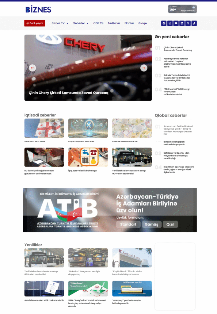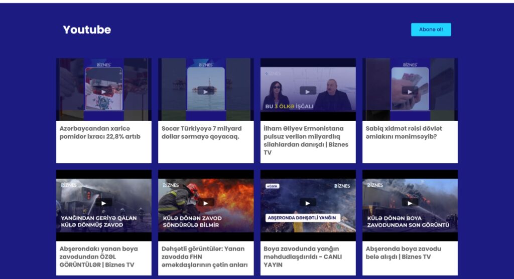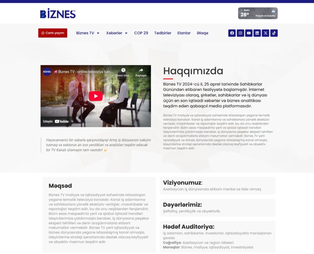 biznestv.az Biznes Televiziyanın veb sayt üzərində fəaliyyətini aktiv saxlamaq üçün hazırlanıb. Saytda bir çox istiqamətli xəbər kateqoriyaları üzrə paylaşımlar mümkündür. Həmçinin Youtube API key vasitəsi ilə Youtube birbaşa veb sayta inteqrasiya olunub. Bu inteqrasiya sayəsində videolar avtomatik olaraq veb sayt üzərində də görünür. Həmçinin canlı yayım funksiyası da aktivləşdirilib.
